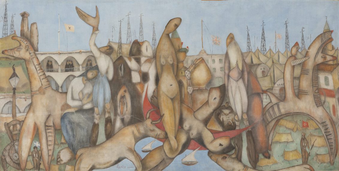 George Pol. Georghiou (Famagusta, 1901-1972) studied law in London. He worked as a solicitor until 1938, at which time he turned exclusively to painting. A self-taught artist, he learnt from the art of the past and the art of his time through private study and frequent visits to museums and galleries. He developed a productive dialogue with the pursuits of Modernist movements, as well as with the works of older artists, primarily El Greco. He also studied ancient, Byzantine, Gothic and folk art, going on to shape his own distinctive artistic language. His subject matter is dominated by the human form, landscapes with buildings, and compositions featuring religious content or topics from contemporary historical reality.