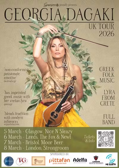 Georgia Dagaki’s powerful voice and distinctive Cretan lyra blends Greek tradition with modern rock and pop influences.